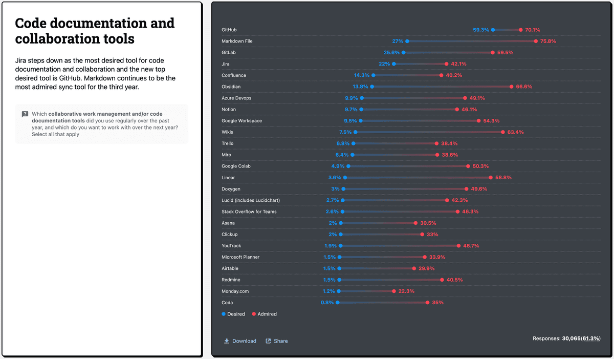 Jira stepped down as the most desired collaboration tool this year. After years of dominance, the tide has turned. Markdown, plain text files, remains the most admired sync tool for the third year running. Developers are choosing simplicity over features. They would rather coordinate through text files than through complex platforms.